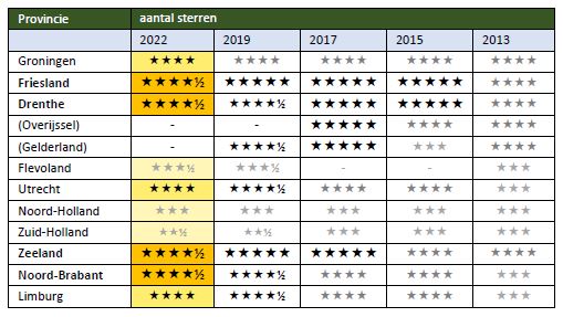 We zeggen het zo vaak: de fietsmogelijkheden in Nederland zijn eindeloos. Alleen al dankzij de bijna 35.000 kilometer aan bewegwijzerde fietsroutes in Nederland. Vorig jaar maakten Nederlanders in totaal zo’n 700 miljoen recreatieve fietstochten: lange of korte tochtjes, en zowel vanaf huis als tijdens de vakantie. De fietsmogelijkheden zijn dus groot, maar de kwaliteit van het recreatieve aanbod verschilt per provincie. Via het onderzoek de Kwaliteitsmonitor heeft het Fietsplatform, organisatie achter Nederland Fietsland, de verschillen onderzocht. Afhankelijk van de scores ‘verdienen’ provincies een aantal sterren. Dit jaar scoren Friesland, Drenthe, Zeeland en Noord-Brabant met 4½ ster het hoogst. De maximale 5 sterren is weer een status om naar toe te groeien.