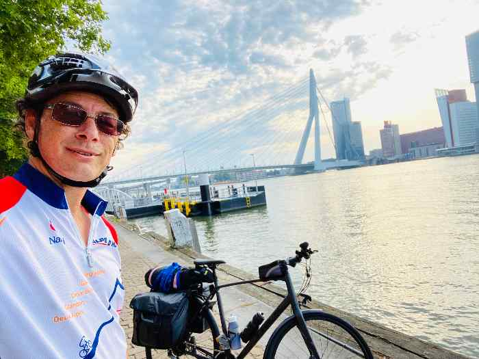 Erik fietste de LF Maasroute 9 en 10 augustus 2021 en 29,30,31 mei 2021. Een lange fietsroute stond altijd al op zijn lijstje om eens te doen. Toen zijn oog viel op de LF Maasroute was hij verkocht. Vol goede moed begon het avontuur vanaf zijn woonplaats Zoetermeer. Vroeg in de ochtend op de fiets richting de Erasmusbrug in Rotterdam, een uur fietsen van huis. Bepakt en bezakt op een gloednieuwe trekking fiets. Het beloofde warm te worden.