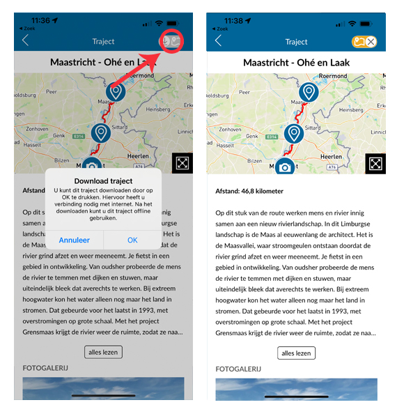 Om datagebruik onderweg te beperken kun je de kaarten downloaden voor offline gebruik. Het downloaden gaat automatisch door rechtsboven op de grijze kaart te klikken. Is het kaartje oranje? Dan is hij klaar voor offline gebruik. Vanwege de opslagcapaciteit is er een limiet van het te downloaden trajecten. Krijg je een melding dat het downloaden mislukt dan dien je eerst oude kaarten te verwijderen.