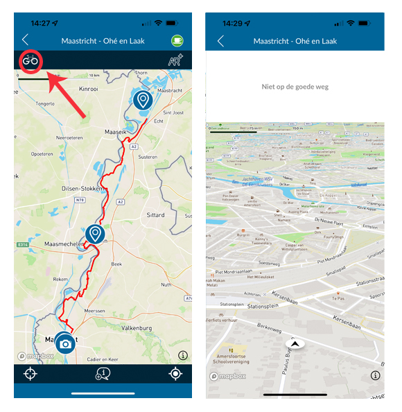 Met het fietsicoontje linksboven kom je bij het navigatiescherm. Vervolgens is het een kwestie van het pijltje blijven volgen, deze beweegt zich over de rode lijn. In het voorbeeld bevinden wij ons op kantoor, ver weg van de route, je ziet daarom de melding bovenin “niet op de goede weg”.