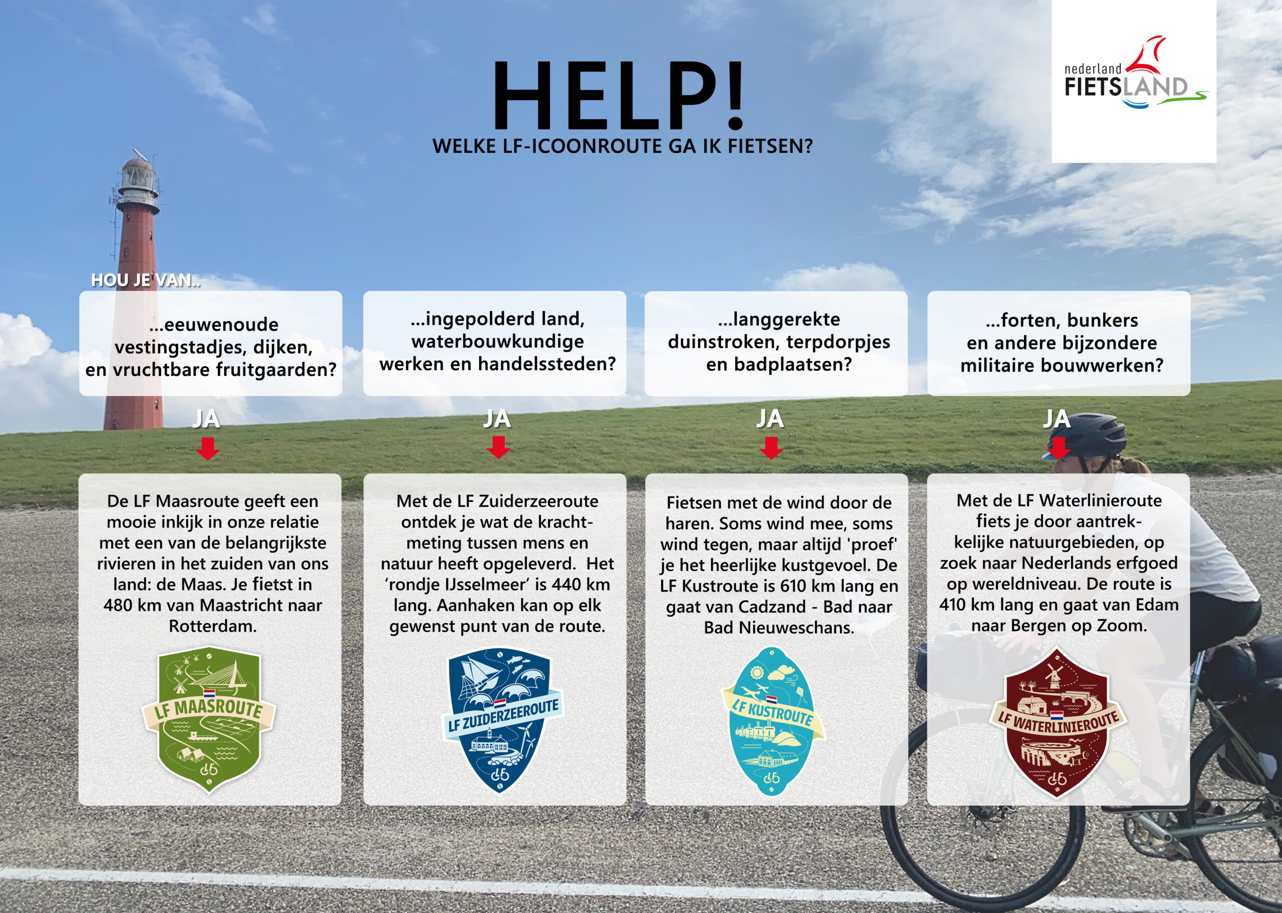 Vind je het lastig kiezen welke LF-icoonroute je als eerste gaat fietsen? Of misschien heb je er al één of twee gefietst, maar weet je niet wat de volgende gaat worden? Dan hebben we hieronder een handig overzicht om je op weg te helpen. Klik op de afbeelding voor een grotere versie. Keuze gemaakt? Ga dan naar de website van de LF Maasroute, de LF Zuiderzeeroute, de LF Kustroute of LF Waterlinieroute voor meer informatie.